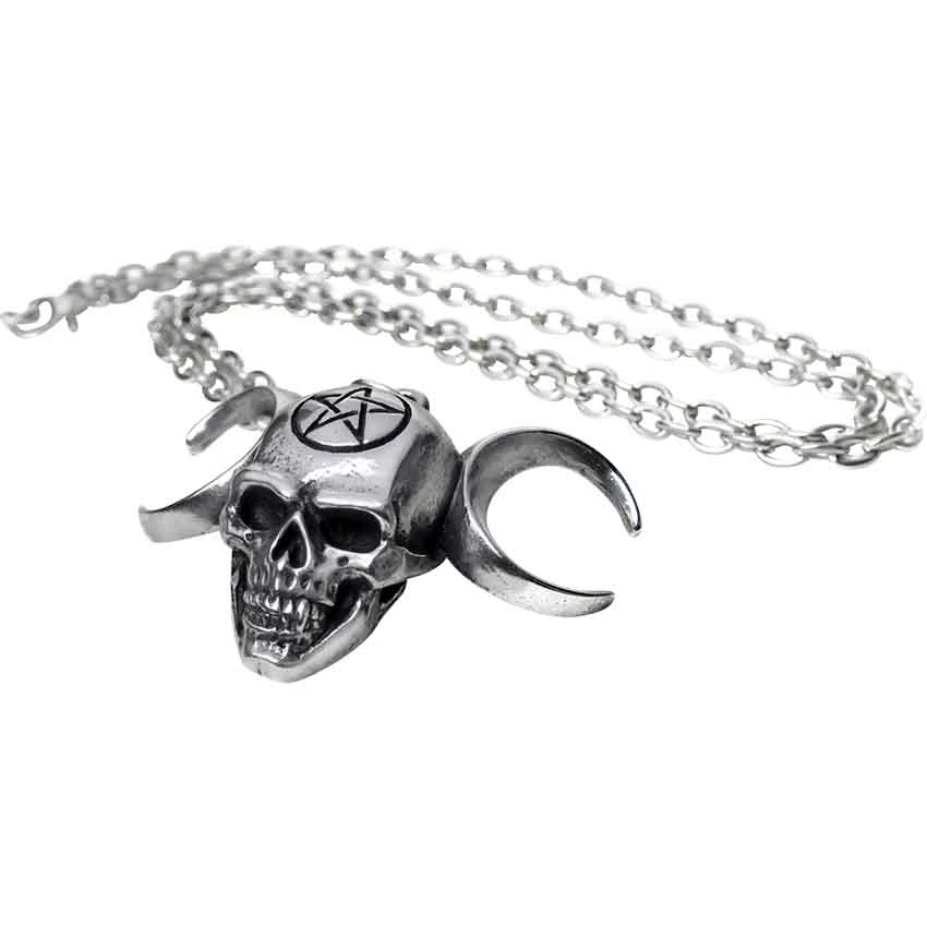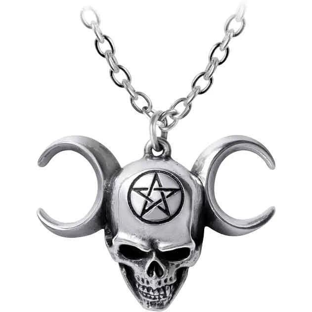 Looking for a triple moon necklace with a macabre twist? If so, you should make sure that you check out the Truinity Skull Necklace. Made from pewter, this necklace depicts a well detailed skull facing downwards. On its forehead, there is an engraved pentacle. On each side of the skull, a crescent moon faces away from the skull. Together the moons and the pentacle form the triple moon goddess symbol. At the top of the skull, there is a jump ring for sliding it on the necklace chain. The chain fastens with a lobster clasp. This necklace makes a wonderful personal accessory or an addition to a Wiccan jewelry collection. The Truinity Skull Necklace also works well with any gothic outfit.