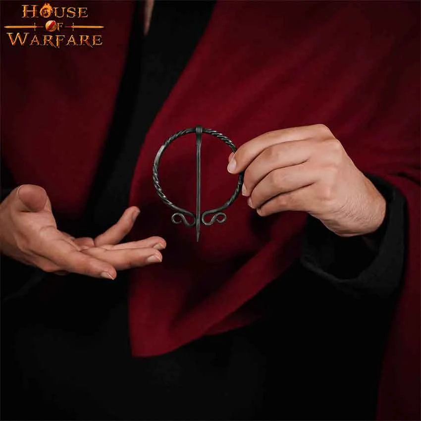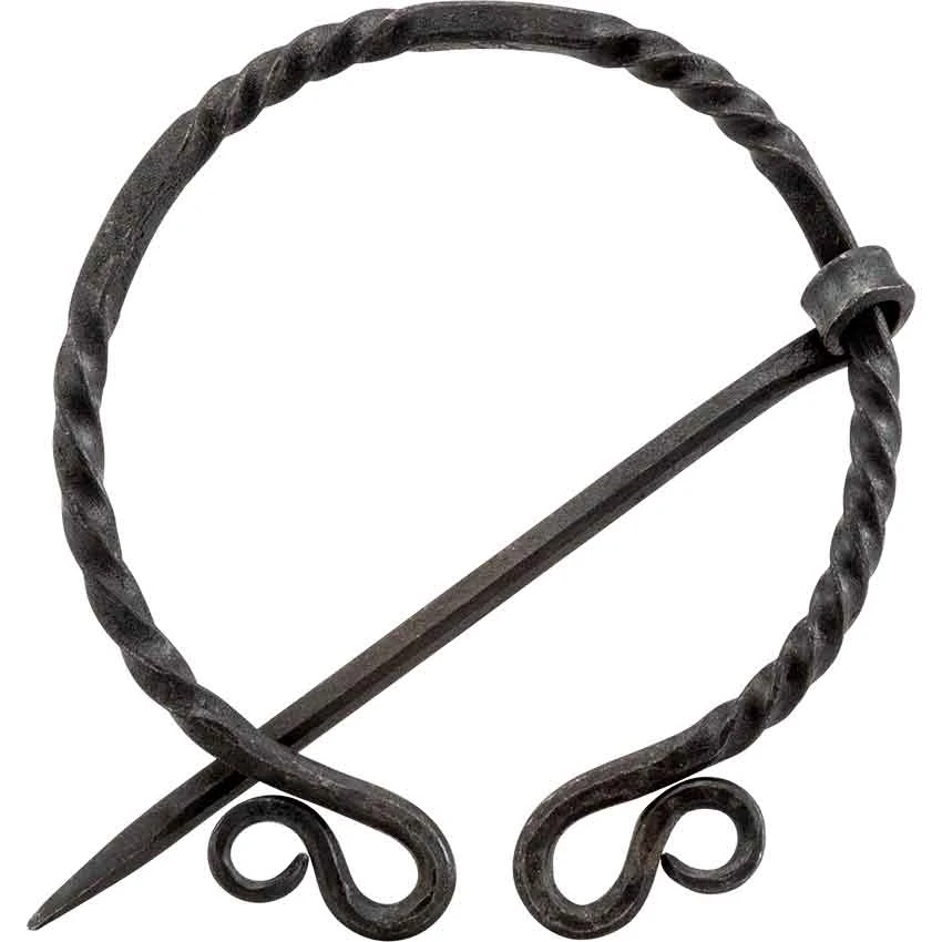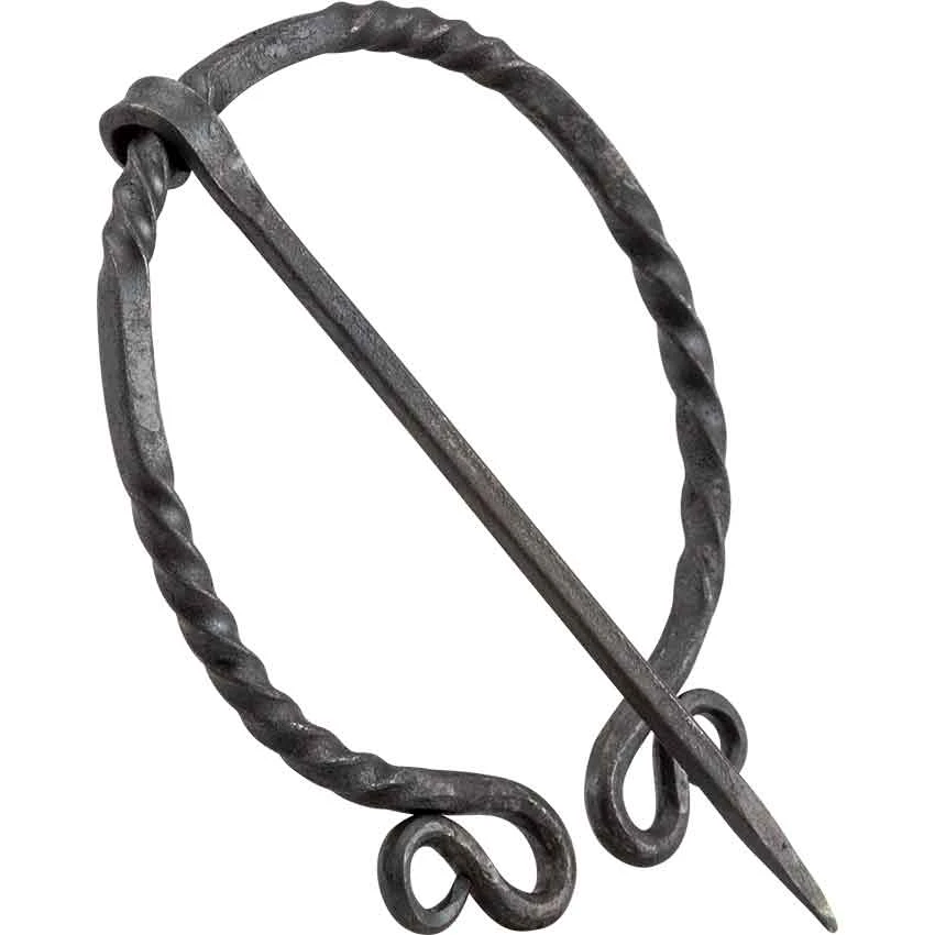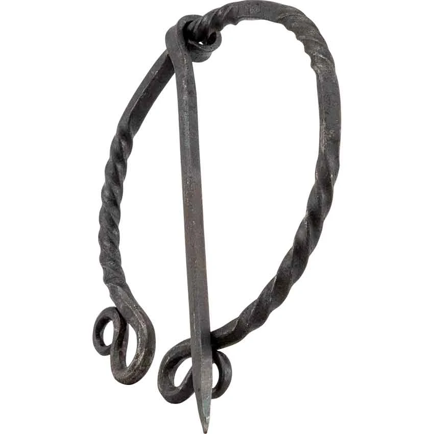Whether a medieval merchant or Roman senator, you would have used a brooch. The Twisted Penannular Pin is a fastener following that long tradition. Many people from different eras and social classes wore similar pins and brooches. A pin fastens this one by sliding along the ring to prevent fabric from sliding off the pin. This wrought iron ring of the pin features interspersed gentle twisting. The unpolished finish showcases the forged appearance of the brooch. The ring finishes into two wavy tails. Wear this medieval pin as a part of a variety of costumes at a historical reenactment or LARP event.
