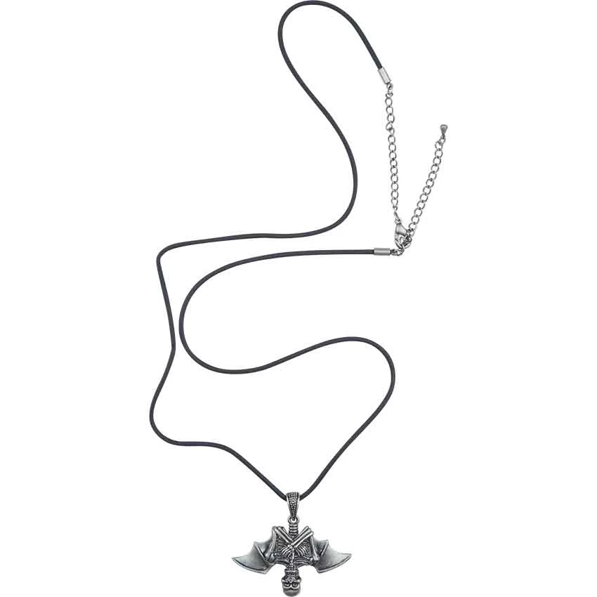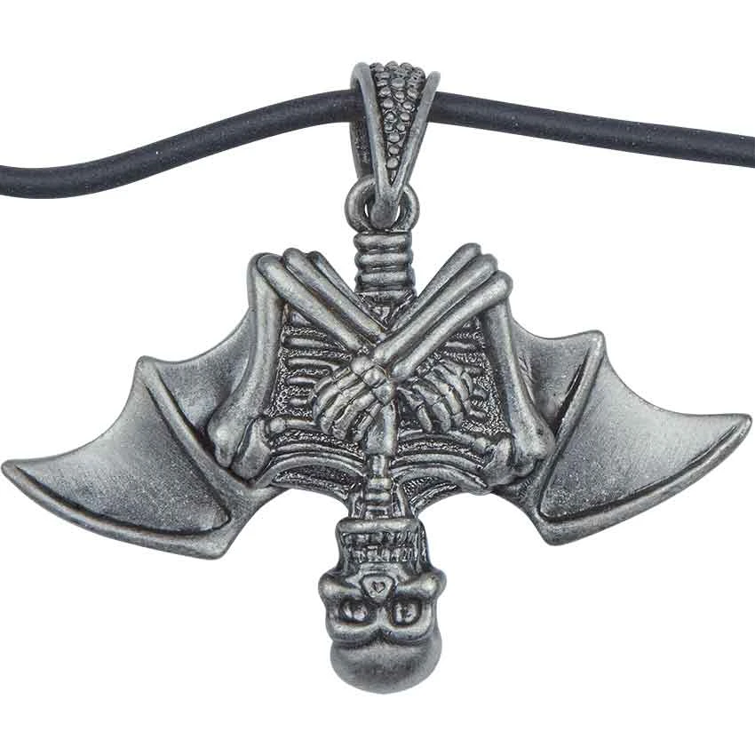 Vampires are often said to be immortal, but it seems as though some unfortunate run-in has stripped this vampire to the core. The Vampire Skeleton Necklace depicts a skeleton torso with outstretched bat wings and crossed arms. This unique pendant features a loop attached to a spine segment at the end of the torso, so when worn it hangs upside down. This eye-catching skeleton pendant makes a fun gift for any loved one with a fondness for vampires. Wear this eerie jewelry piece yourself as a unique statement piece.