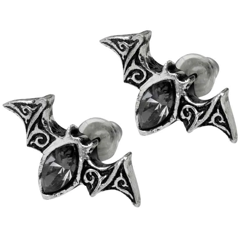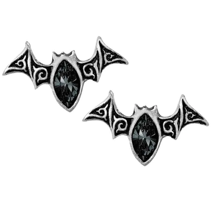 With their subtle beauty and grace, the Viennese Nights Studs are perfect for those occasions when you wish to moonlight as a vampire, or add a gothic twist to a modern outfit. Complete your look with this stylish pair of bat earrings. Handcrafted from polished, antiqued pewter, these stylized bat silhouettes feature fine detail. Beautiful Venetian patterns decorate their outstretched wings, and black Swarovski crystals accent their bodies. Surgical steel ear posts keep the earrings firmly in place.