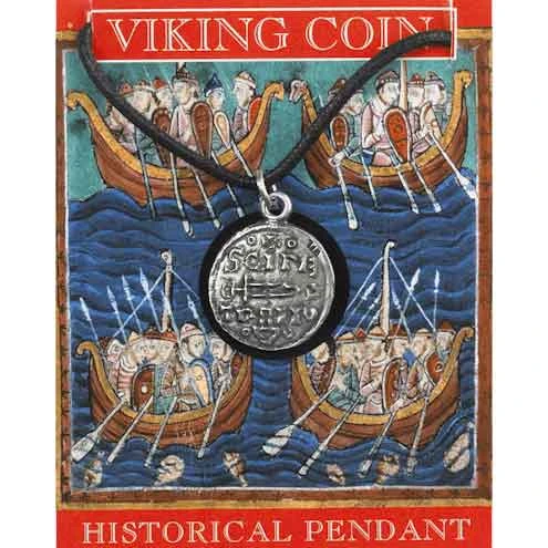 This reproduction Viking Coin Necklace is made from lead-free pewter and is supplied on a waxed cord. The information card is full color on the front and has historical information on the reverse. The Viking Coin Necklace is a great gift idea for that Viking enthusiast or Norse collector in your life or everyday use for yourself. The term Viking is used to refer to the Scandinavian explorers, warriors, merchants, and pirates who raided, traded, and settled in wide areas of Europe and the North Atlantic islands. Once the Viking invaders began to settle in England, they began to issue coins of their own. Most of the early Viking coins were imitations of the more established Anglo-Saxon coinage. Later coins carried the name of the Viking kings who issued them.