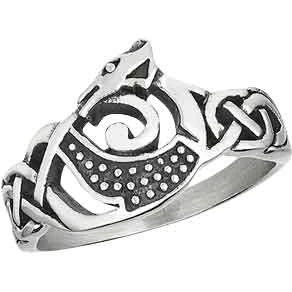 Are you wanting an accessory that works with both your historical and modern wardrobes? Check out the Viking Dragon Knotwork Ring. Made from stainless steel, this fantasy ring comes in six sizes. It has a band that widens towards the front. Knotwork detailing adorns the band of the Viking ring. In the center, the knotwork transforms into a stylized dragon. The dragons head faces left. It has a dotted body that features a darkened finish. You can add this ring to any Viking outfit or Norse jewelry collection.