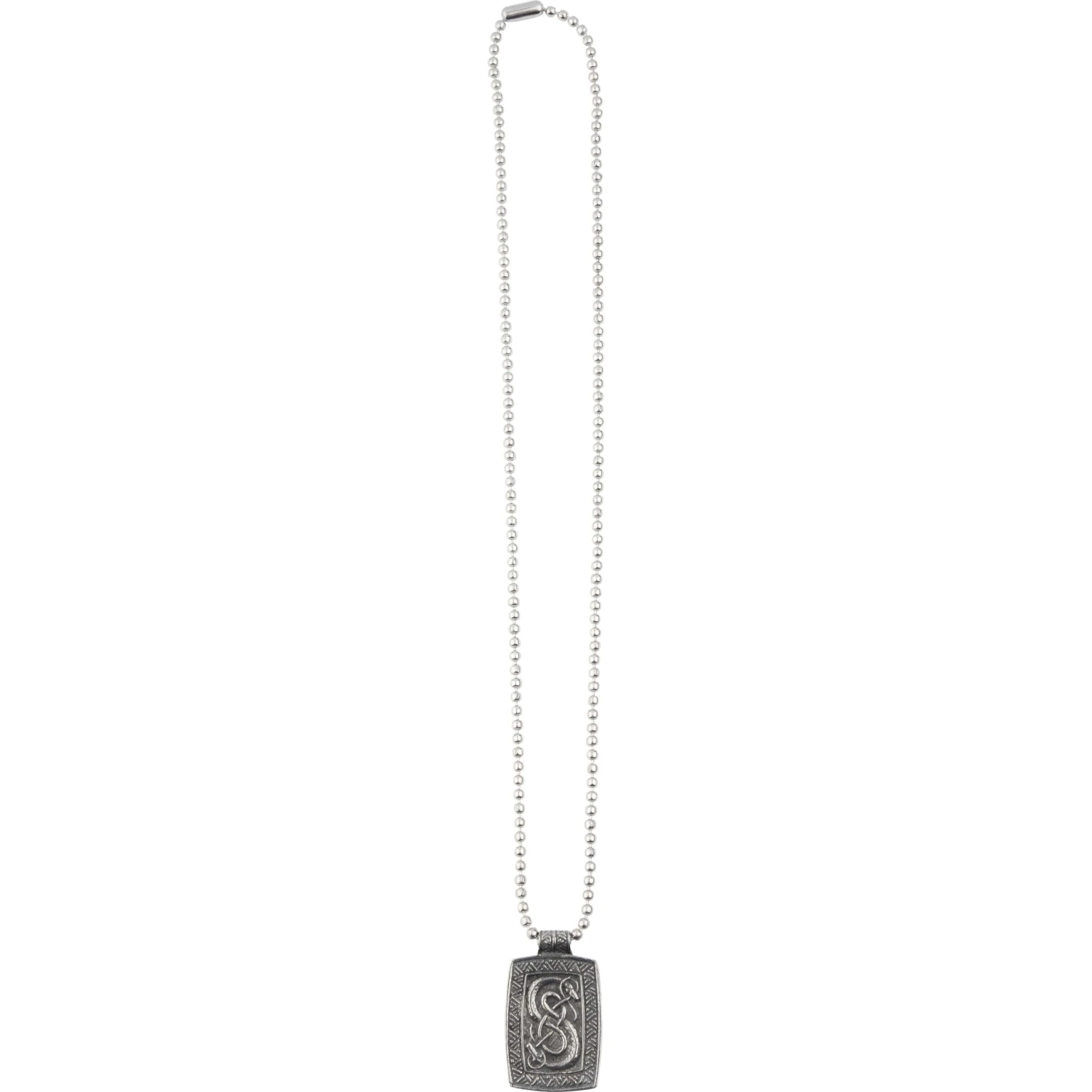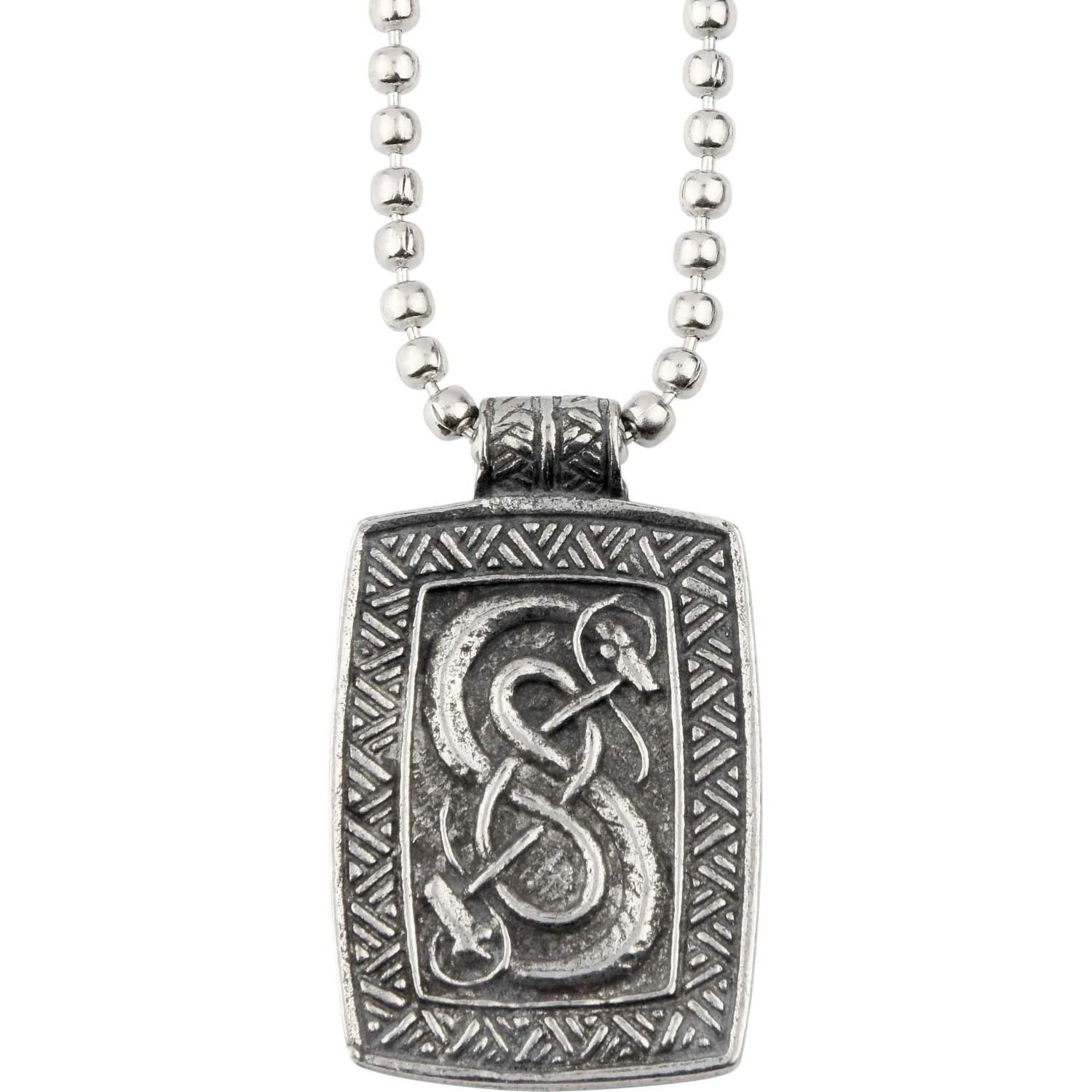 Located in Norway, the Urnes Stave Church is one of the oldest Viking Age relics to still exist. This Viking Snake Necklace recreates the snake designs carved on the North portal of the church, which have been studied for centuries. With a chain included, this lead-free pewter necklace is great for gifting or for incorporating into your personal jewelry collection. The necklace features a rectangular shape, the outer edge etched with lines. Within the rectangle, a snake curls upwards and twists into an eye-catching pattern to beautifully replicate the design found on the Urnes Stave Church. Whether you have been able to behold these carvings with your own two eyes or not, you can bring their stunning design into your wardrobe with the Viking Snake Necklace.