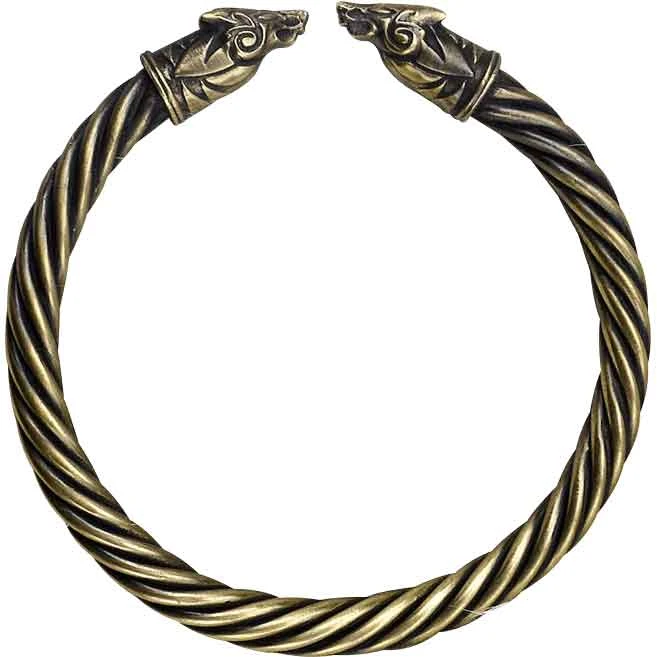 Well-known for their battle prowess, the Vikings also had a distinctive look. Add a piece of this influential style with a fierce addition to your everyday or reenactment wear with the Viking Wolf Head Bracelet. The brass ring of this bracelet features a twisted rope design. The tips of this open-ended bracelet are adorned with wolf heads. They add a special touch to this accessory that makes it a must-have addition to your wardrobe. Able to go from one outfit to the next, the bracelet is an ornate and stylish accessory reminiscent of an influential culture from centuries ago.