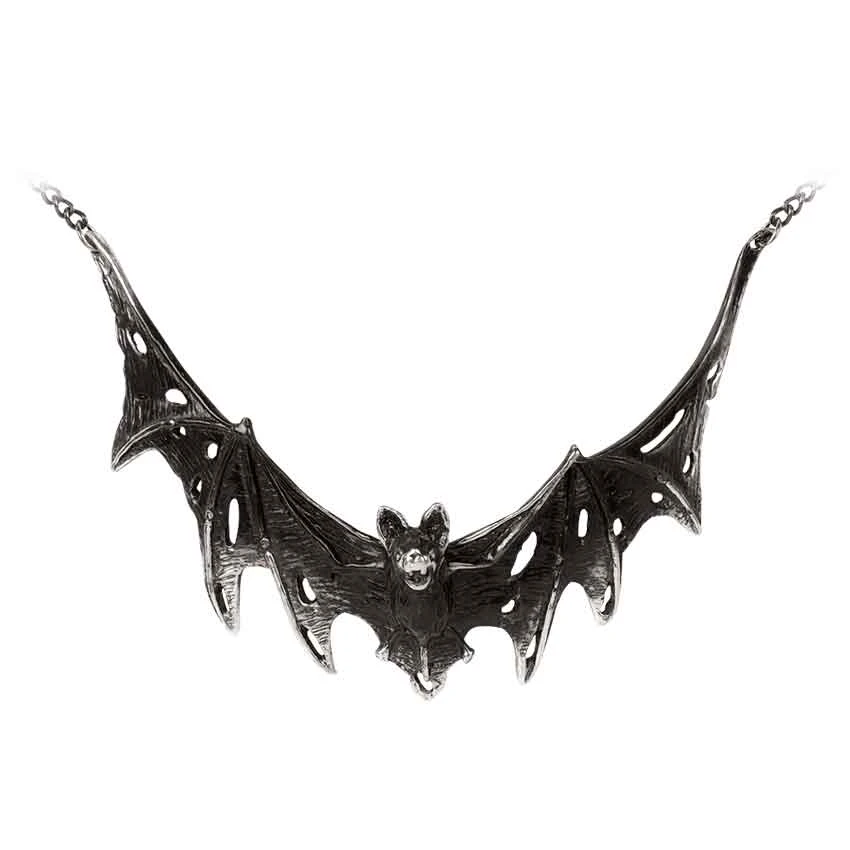 Flitting through the silent, candlelit darkness of the solitary lakeside manor of Villa Diodati, the creature unknowingly gives rise to tales of dark mystery. The Villa Diodati Necklace depicts a detailed vampire bat in flight. In 1816, authors Polidori and Mary Shelley were among the guests at the Villa, where they created landmark works such as The Vampyre and Frankenstein. This gothic necklace celebrates their creation with its excellent detail. Crafted from high-quality pewter, the ragged bat has been given a blackened finish for a striking look. A split black curb chain attaches to the end of each wing and fastens in the back with a clasp. Showcase your own gothic triumphs by making this dark accessory a statement piece in your look.