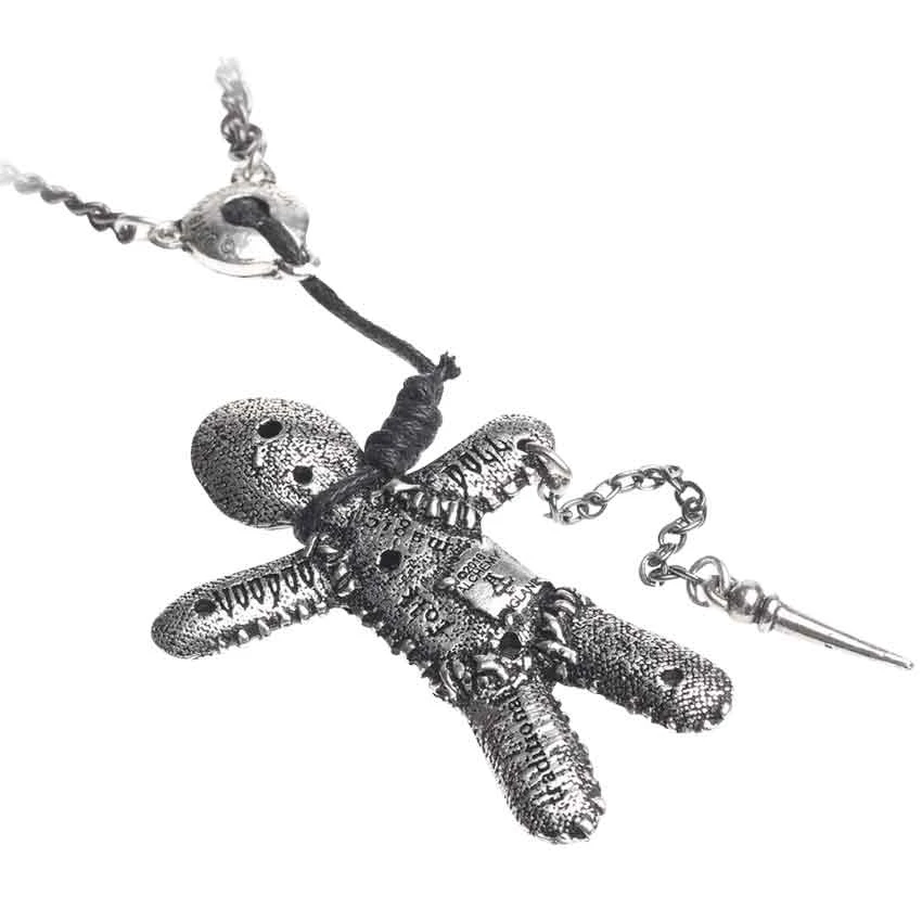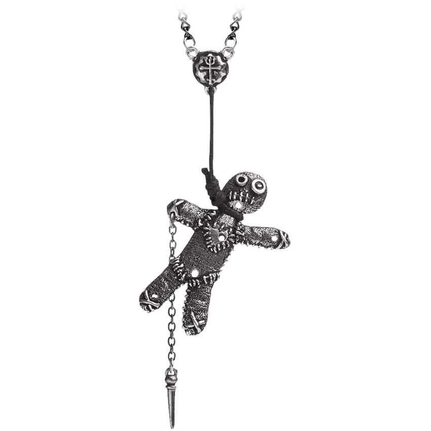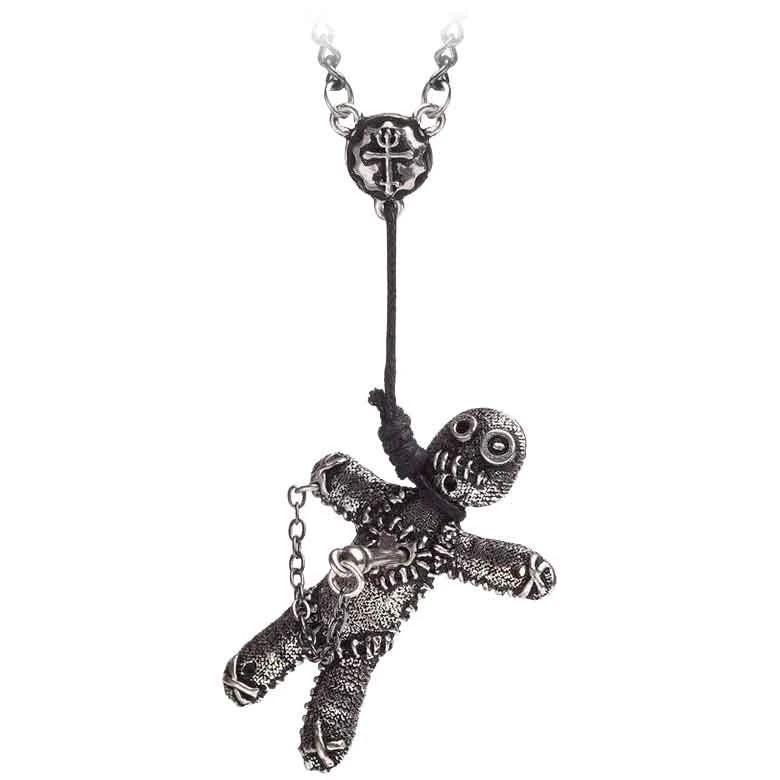Inspired by ancient European origin, this Voodoo Doll Necklace resembles the cunning folk method of breaking an enchantment set by a malevolent witch. These poppets could be used either to heal or curse as a form of sympathetic magic. Handcrafted from fine English pewter, this Gothic necklace features an antiqued pendant of a hastily stitched voodoo doll with peg holes at the six principle body points (eye, mouth, heart, stomach, hand, and foot). A short length of blackened chain from the right hand holds a peg pin, used for focusing ones attention on a specific area for healing. The eerie pendant is suspended from a hangmans rope of black cord, from a pewter bail, on a split blackened, 21 inch curb chain, with a clasp fastener. The bail is engraved with an esoteric sigil resembling a trident. A curious personal accent or gift idea, the Voodoo Doll Necklace is a noteworthy piece with elements of Gothic style.