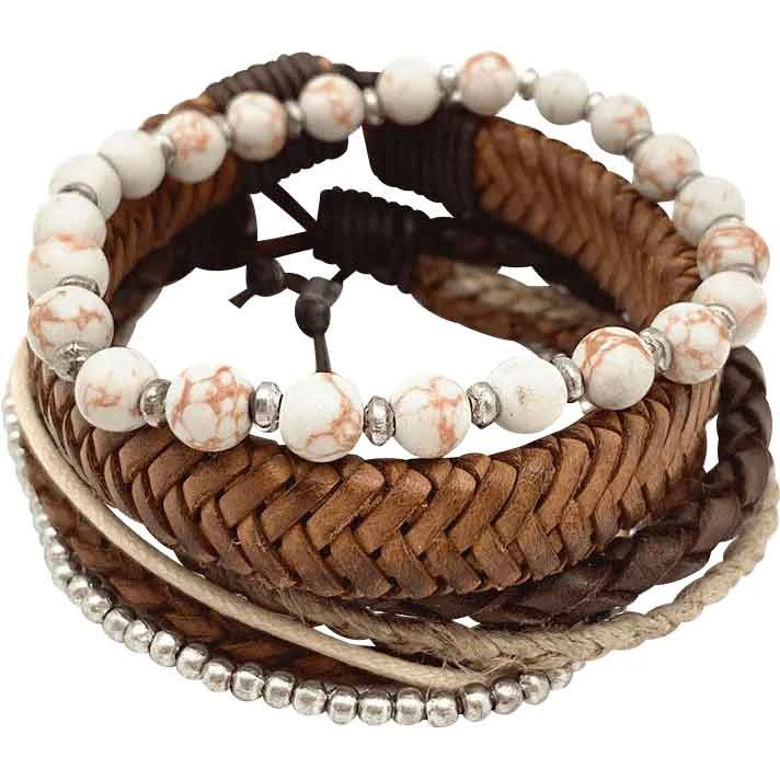 You can easily add a bit of style to your historical reenactment or cosplay outfit with the White and Brown Viking Bracelet Set. This Viking bracelet set includes three bracelets. One of the medieval leather bracelets has a beaded design. It alternates between small silver-colored beads and larger round white beads. The white beads have light-brown marbling. The next bracelet has a wide braided band. It is brown and ties together at the ends. The final bracelet has multiple strands. It has a dark brown braided strand, a braided jute twine one, a tan cord strand, a lighter-brown strand, and a silver beaded band. You can wear this Norse bracelet set with a variety of medieval and Viking looks. It makes a great finishing touch.