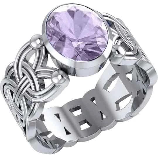 Borre style knots and art appeared by year 850 and was still in use during the tenth century by Vikings. The symmetrical braiding is similar to that of Celtic knots, as seen in the White Bronze Borre Knot Gemstone Ring. A lovely purple gemstone sits at the top of the band. Made from white bronze, the knotwork ring is plated with sterling silver that gives it a bright gleam. Be sure to check out other fine pieces of our medieval jewelry to complete your look! This ring comes in US sizes 6 to 12.