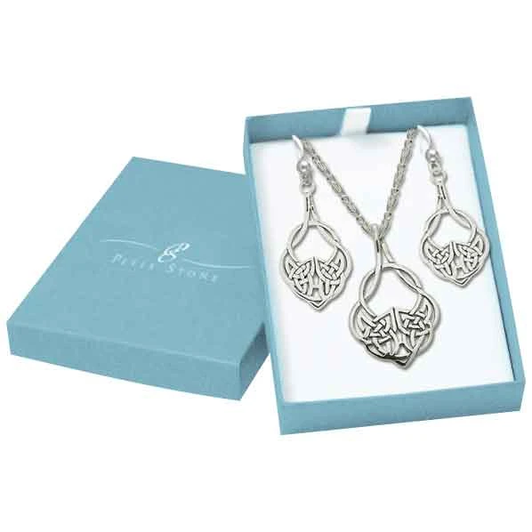 The beauty of Celtic knotwork is beyond compare, making this charming jewelry set an excellent option when choosing accessories for your look. The White Bronze Celtic Knot Jewelry Set includes a matching necklace and earrings. The endless knot pattern displays incredible intricacy, appearing in a teardrop shape with a hollow center. The knotwork pendant hangs on a fine chain, while the Celtic earrings dangle from thin wire hooks. Crafted from fine white bronze, this Celtic jewelry set features a brilliant gleam. Whether you are looking for a top notch gift or a stunning personal accessory, the Celtic Knot Jewelry Set will suit perfectly!