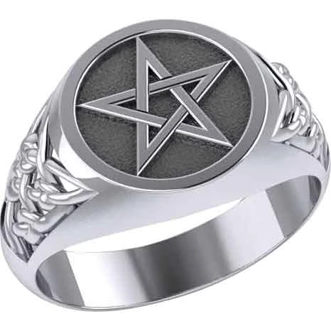 Invoking the four classical elements with the addition of Spirit as a fifth, the pentacle remains a symbol that has stood the test of time. The White Bronze Celtic Pentacle Ring displays a round pentacle at the top of the design. Along each side, Celtic knotwork decorates the band. Made from white bronze, the pentacle ring is plated with sterling silver that gives it a bright gleam. Be sure to check out other fine pieces of our Wiccan jewelry for a complete look! Perfect for men or women to wear, this ring comes in US sizes 6 to 15.