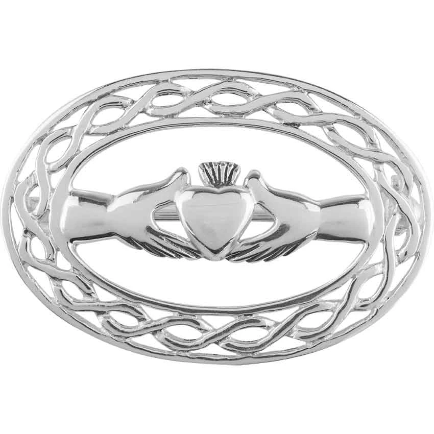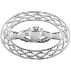 Combining two noteworthy Celtic symbols, the White Bronze Claddagh Knotwork Brooch features a striking Claddagh design in the center of an oval knotwork border. This Celtic pin makes a fine icon of eternal friendship and love. The cutout Claddagh is formed from hands that hold a crowned heart. This elegant Claddagh brooch is made from white bronze that has been plated with sterling silver to give it a fantastic gleam. This Irish pin works well as a gift for a loved one or a personal accessory!