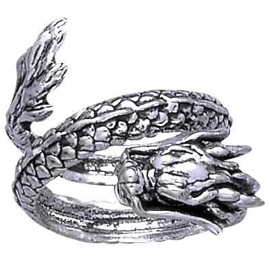 This Asian-inspired dragon coils in a graceful circle, wrapping your finger in a complete circuit. The White Bronze Coiled Eastern Dragon Ring shows off the whiskers and horns of this iconic, legendary creature. The body of the dragon displays a scaled pattern, and the tail ends in a fin. Made from white bronze, the dragon ring is plated with sterling silver that gives it a bright gleam. Perfect for men and women, this ring comes in US sizes 6 to 15. Be sure to check out our other fine pieces of fantasy jewelry to create a complete look!