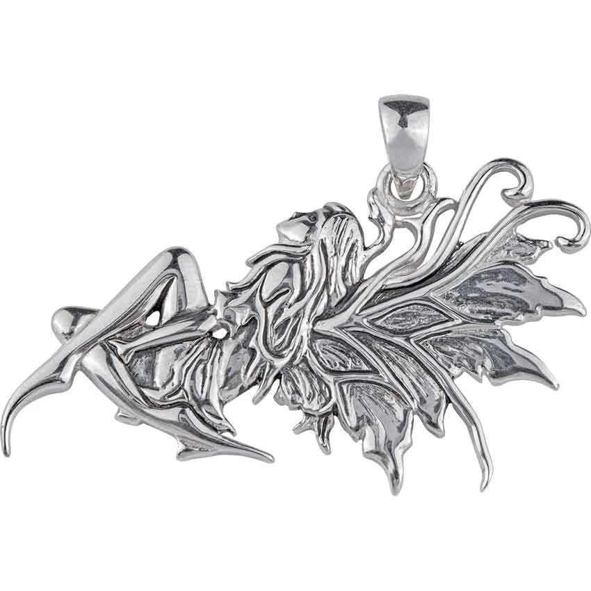 Based on the Birth of Magic artwork by Amy Brown, the White Bronze Daydreaming Fairy Pendant depicts a lovely member of the fair folk sitting with her wings spread as she gazes up into the enchanting world around her. She pulls one knee close while tucking the other beneath her. Made from white bronze, the fairy pendant is plated with sterling silver that gives it a bright gleam.