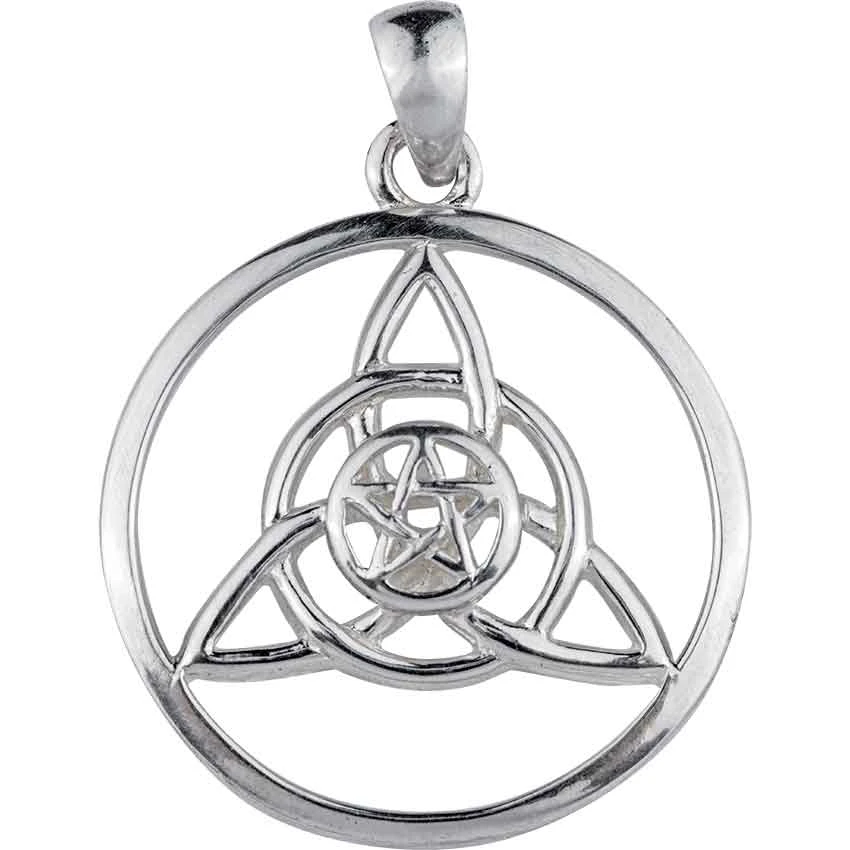 Known as a Druid Amulet, the triquetra and pentagram design of the White Bronze Druid Amulet Pendant offers protection and wisdom to the wearer. The pentagram sits in the middle of the triangular triquetra knot. The triquetra then sits in a circular frame. Made from white bronze, the triquetra pendant is plated with sterling silver that gives it a bright gleam.