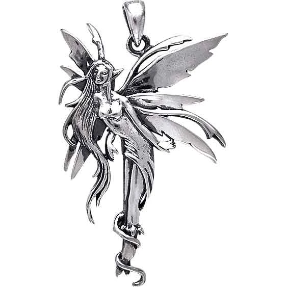 Often mistaken for lightning bugs as they flit about in the dusk covered in glowing fairy dust, fairies like the one in the White Bronze Firefly Fairy Pendant show off a spirit of enchantment, whimsy, and independence. This winged fairy bends forward slightly as she hovers in the air, letting her long hair drape down over her shoulder. Made from white bronze, the fairy pendant is plated with sterling silver that gives it a bright gleam.