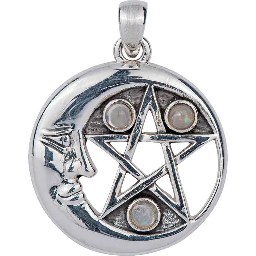 The moon and pentagram each possess a wealth of meaning within Wiccan beliefs, standing for the Goddess and the five elements. The White Bronze Gemstone Pentagram Moon Pendant depicts a crescent encircling a pentagram. The moon shows off a face design, and three synthetic gemstone accents appear around the pentagram. The gems are available in rainbow moonstone. Please note that certain options may come with a price adjustment. Made from white bronze, the round pentagram pendant is plated with sterling silver that gives it a bright gleam. Be sure to check out other fine pieces of our Wiccan jewelry to complete your look!