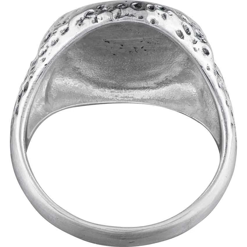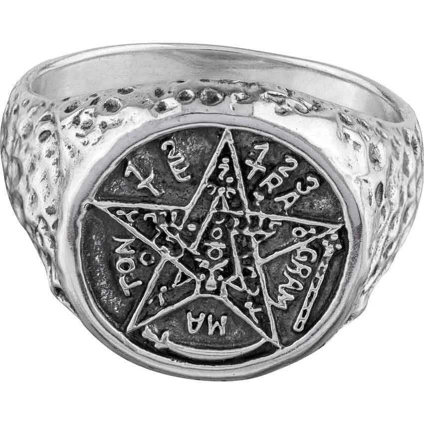 A signet ring that gave King Solomon the ability to command genies and speak with animals, the Seal of Solomon is often depicted with a pentagram design. The White Bronze Seal of Solomon Ring reimagines the magic ring. Around the central pentagram, numbers and phrases give the piece an occult look. The sides of the ring are textured to give it an aged appearance. Made from white bronze, the pentacle ring is plated with sterling silver that gives it a bright gleam. Be sure to check out other fine pieces of our Wiccan jewelry for a complete look! Perfect for men or women to wear, this ring comes in US sizes 6 to 15.