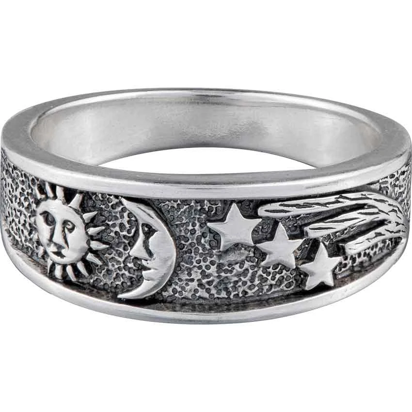 The celestial bodies possess rich meaning in their symbolism, which appears in a number of cultures and belief systems. The White Bronze Shooting Star Celestial Ring shows off a sun, moon, and stars design over the band. The sun and moon each display facial details, while the three shooting stars finish off the design. Each element stands out against the textured background. Made from white bronze, the astrology ring is plated with sterling silver that gives it a bright gleam. Be sure to check out other fine pieces of our Wiccan jewelry for a complete look! This ring comes in US sizes 6 to 12.