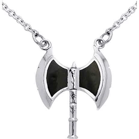 A fierce looking tool and weapon, the double sided axe that forms the central piece of this necklace shows off black blades that fan out to the sides. The White Bronze Viking Axe Necklace makes a striking accessory. The axe, which resembles the Grecian labrys, displays small notches and a ridged shaft. The chain connects to the tip of each blade. Made from white bronze, the Viking necklace is plated with sterling silver that gives it a bright gleam. Be sure to check out other fine pieces of our medieval jewelry to complete your look!