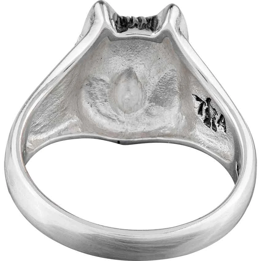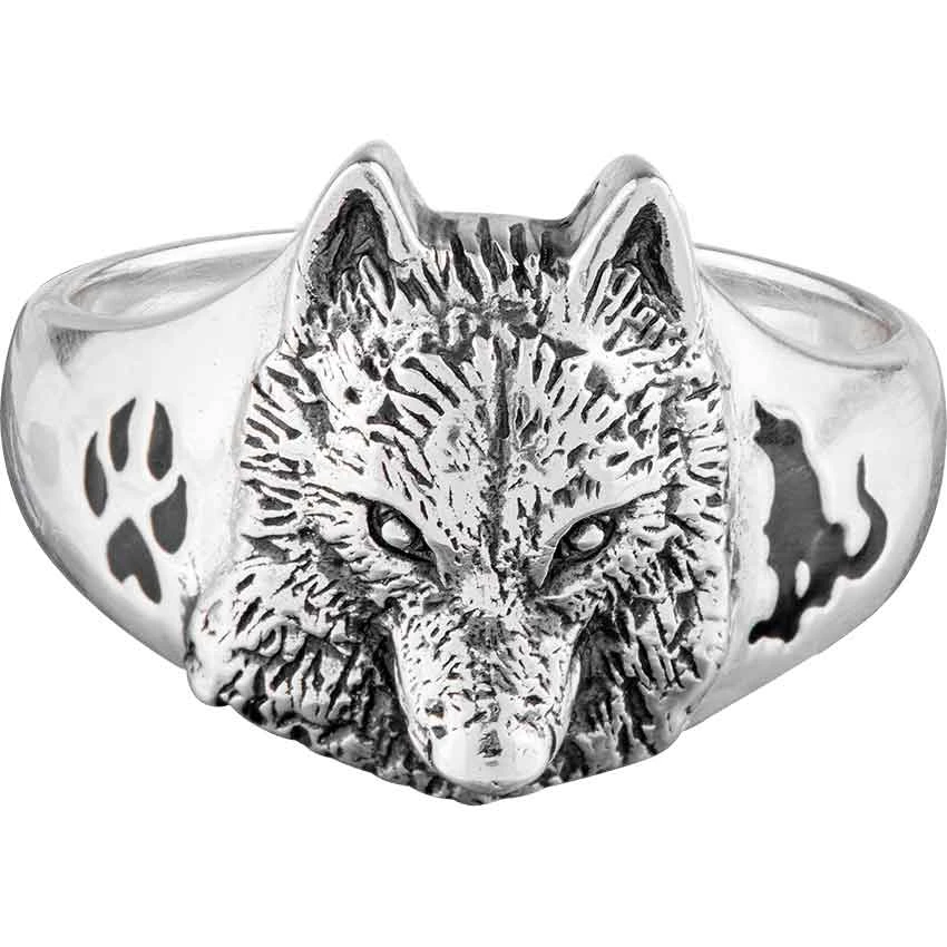 A symbol of loyalty, cunning, and compassion, the wolf possesses many admirable qualities as a pack member and protector of balance in wildlife. The White Bronze Wolf Ring displays three wolf designs across its band. Designed by artist Ted Andrews, the dimensional ring displays a detailed wolf head in the center with a paw print appearing on one side and a howling wolf on the other. Made from white bronze, the wolf ring is plated with sterling silver that gives it a bright gleam. Perfect for men or women to wear, this nature ring comes in US sizes 6 to 15.