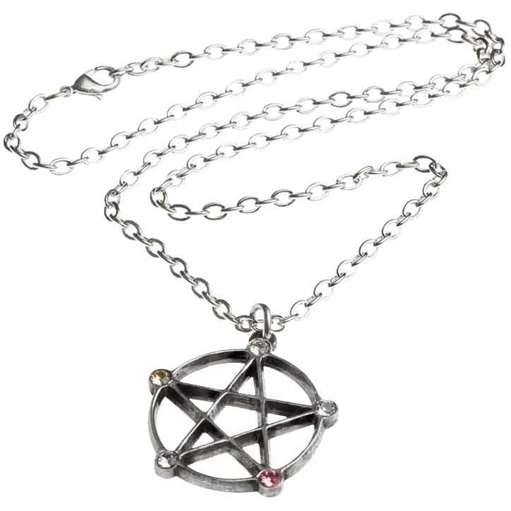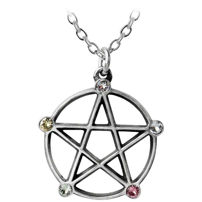 The Wiccan Elemental Pentacle Necklace symbolizes the key components of the universe. While each holds its own distinct aspects, together they create a delicate balance. The beauty and meaning behind this pendant is sure to inspire. Pastel-colored Swarovski crystals mark the five points of the enclosed pentagram. The upward point of the star represents the most ethereal element, spirit. A clear, white crystal sits at its peak. A sky blue gem signifies water, champagne pink embodies fire, tea green denotes the earth, and jasmine yellow stands for air.
