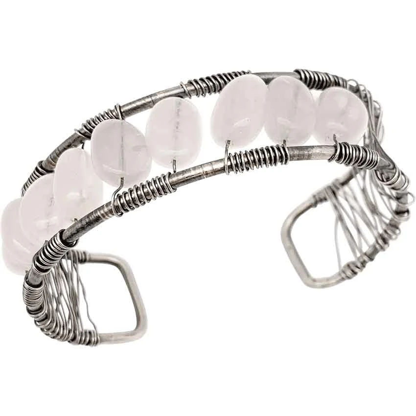 As a noble lady, you require an elegant piece to finish off your look like the Wire-Wrapped Rose Quartz Medieval Cuff Bracelet. Handmade from brass, this bracelet features an open-cuff design that makes it slightly adjustable. Next, the silver-colored band has a thick wire structure that forms the cuff. Thin wire wraps across the two sides, filling in the band. The wire runs through oval-shape beads. Each bead is a rose-quartz stone. This cuff bracelet makes a wonderful everyday accessory or a costume piece. You can add this medieval cuff bracelet to many different outfits.