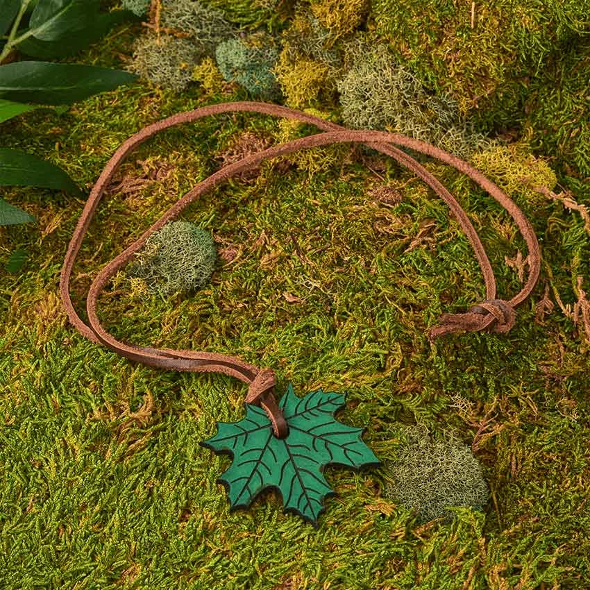 Display your affiliation with the elves, druids, or other nature beings when you wear this Woodland Warrior Leaf Necklace. Available in brown with a brown leather lace, green with a brown leather lace, or red with a black leather lace, this leaf accent coordinates with any of our woodgrain or leaf armour. Strung on a long leather lace, you can knot this necklace to your desired length and trim the excess ties. Hand crafted from high quality leather in our shop, this leaf displays a unique engraved and dyed design. Great for identifying members of a combat unit or LARP team, this Woodland Warrior Leaf Necklace is lightweight and comfortable to wear at any gathering.