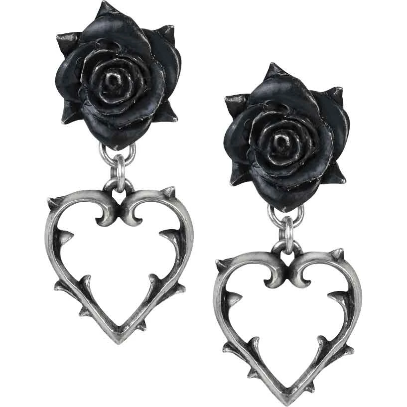 A rose symbolizes love, but black is the color of doom and death. The Wounded Love Earrings display black acrylic rose blossoms that dangle thorny hearts. These gothic earrings are crafted from English pewter with blackened details. These black rose earrings are sold as a matching pair, and they do required pierced ears to wear. The studs are made with surgical steel posts. A marker of the deep hole left by a dark and mysterious romance, these gothic rose earrings serve as a captivating reminder of past loves.