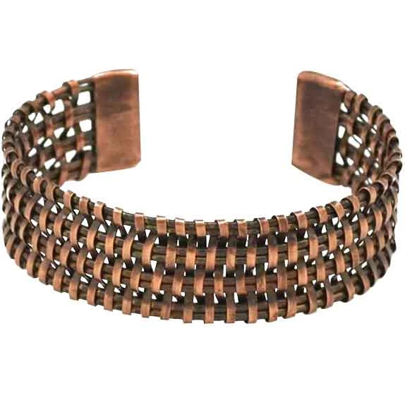 The Woven Copper Cuff Bracelet is handcrafted for a rustic, artisan look that perfectly suits historical and medieval fantasy styles. This mixed metal bracelet has an antiqued copper tone throughout and has a gently adjustable fit. Strips of metal are interwoven together to create this medieval bracelets structure, which ends with two antiqued copper tone tabs. Whether you are dressing as a medieval peasant, townsperson, noble, or even a Viking warrior or unique fantasy persona, this rustic cuff bracelet makes a fine accessory for any look.