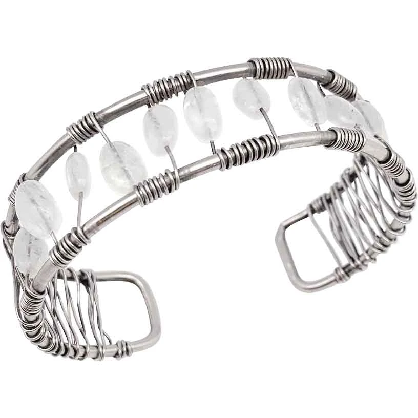 No matter if your character is magical or medieval, they will look stylish when they wear the Wrapped Moonstone Fantasy Cuff Bracelet. Handmade from brass, this medieval bracelet features an open-cuff design that makes it slightly adjustable. Next, the silver-colored band has a thick wire structure that forms the cuff. Thin wire wraps across the two sides, filling in the band. The wire runs through oval-shape beads. Each bead is a moonstone. This fantasy cuff bracelet makes a great everyday accessory or a costume piece. You can add it to many different outfits.